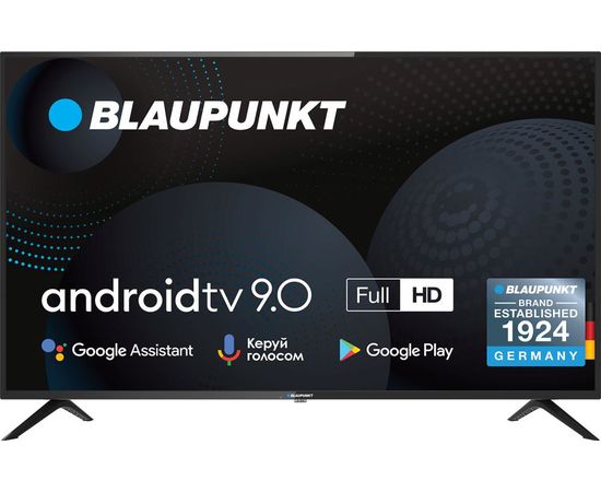 Ապրանքանիշ: Blaupunkt; Գույն: սև; Ընդհանուր բնութագիր Հայրենիք: Գերմանիա; Էկրան Անկյունագիծ: 43; Էկրան Կետային խտություն: Full HD 1920 x 1080 ; Smart հնարավորություն Օպերացիոն համակարգ: Android TV; Էկրան Էկրանի տեսակ: LED; Էկրան Ձևաչափ: 16:9; Էկրան Պայծառություն: T[250; Էկրան Կոնտրաստ: 4000։1; Թվային ընդունիչ: DVB C///DVB T/T2; Ձայնային համակարգ Ձայնի հզորություն: 16; Ձայնային համակարգ Բարձրախոս: 2; Ձայնային համակարգ Ձայնային համակարգի տեսակ: Dolby Digital; Ինտերֆեյս USB: 2; Ինտերֆեյս HDMI: 3; Էկրան Էկրանի հաճախականություն: 60; Ընդհանուր բնութագիր Արտադրման երկիր: Ռուսաստան; Էկրան Լուսավորության տեսակ : Direct LED; Հիշողություն: 8 ; Անկյունագծի տարբերակներ: N[43"; Էներգաարդյունավետություն Հոսանքի աղբյուր: 100-240; Էներգաարդյունավետություն Էներգիայի սպառում: 59; Գույն,չափեր և քաշ Գույն: սև; Գույն,չափեր և քաշ Չափերը տակդիրով Լ*Բ*Խ : 96.6*60.9*20.9; Գույն,չափեր և քաշ Չափերն առանց տակդիր Լ*Բ*Խ : 96.6*55.9*6.7; Գույն,չափեր և քաշ Քաշը տակդիրով : 6.5; Գույն,չափեր և քաշ Քաշն առանց տակդիր: 6; Ինտերֆեյս Bluetooth: առկա է; Smart հնարավորություն Smart TV : Առկա է; Smart հնարավորություն Wi-Fi: առկա է; Smart հնարավորություն Web-browser: առկա է; Smart հնարավորություն Հատկություններ: Chromecast///Google play///Netflix; Ինտերֆեյս Ethernet LAN : առկա է; Ինտերֆեյս CI Slot: առկա է; Ինտերֆեյս Ականջակալ- Mini-Jack 3.5 мм : առկա է; Գույն,չափեր և քաշ VESA մոնտաժի ստանդարտ: 200 × 200; Ձայնային համակարգ Ձայնային կառավարման հնարավորություն: Առկա է; Էկրան Էկրանի անկյունագծի չափ: 108; Հեռակառավարման համակարգ Հեռակառավարման վահանակ: Այո