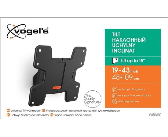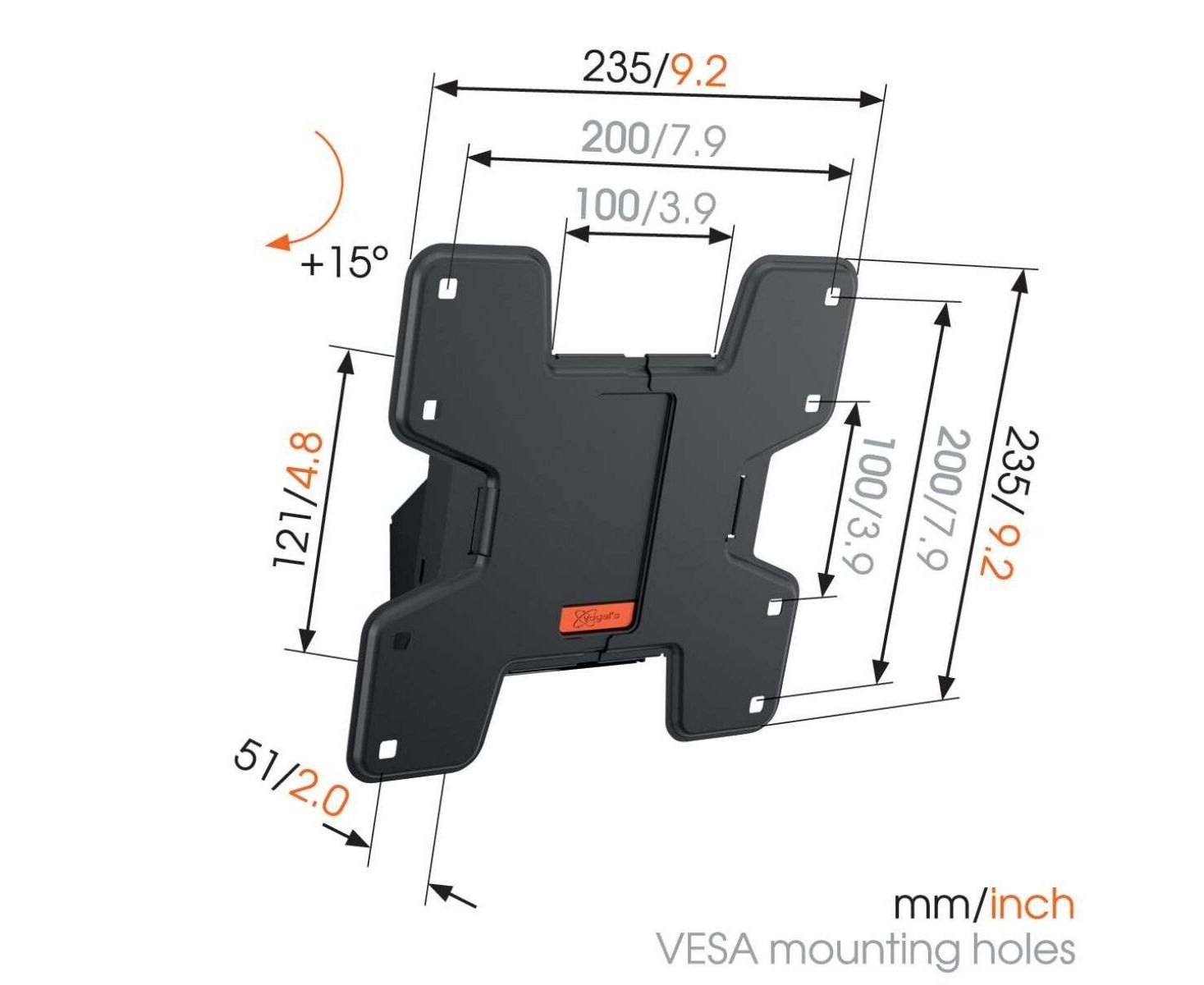Անկյունագիծ19"-43" Տեղադրման տեսակ Պատի Կախիչի տեսակ Թեքվող Թեքման անկյուն +15/-15 ° Առավելագույն բեռ 20 կգ VESA ստանդարտ 75/100/200/200х200 մմ մմ
