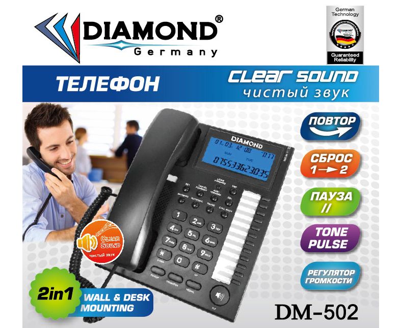 DM-502 հեռախոս LCD էկրան Զանգահարողի ID (թվային հեռախոսային ցանցերի համար) Զgանգի ձայնի ճշգրտում Արտագնա և մուտքային զանգերի մատյան։ Մաքրել բարձր ձայնը Վերջին թիվը կրկնել oneանգի / զարկերակի հավաքման ռեժիմ։Հիշողություն 20 համարի համար։ Դադարի գործառույթ։Պատի վրա տեղադրվող LED զանգի ցուցիչ Ամսաթիվը և ժամանակը կարգավորել։