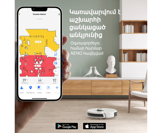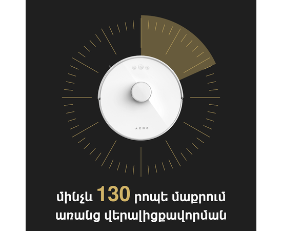 Ապրանքանիշ: AENO; Գույն: սպիտակ; Հզորություն: 28; Կառավարման տեսակ: սմարթֆոն / կոճակ; Կառավարման սեղմակների տեղակայում: Իրանին; Մաքրման տեսակ : Չոր և խոնավ; Փոշու տարայի ամբողջական ցուցիչ: Առկա է; Ձայն Աղմուկի մակարդակ: 65; Չափեր,գույն և քաշ Գույն : սպիտակ; Չափեր,գույն և քաշ Քաշ: 2.7; Սնուցում Սնուցման տեսակ : Մարտկոց; Սնուցում Մարտկոցի տեսակ: Li-Ion; Սնուցում Մարտկոցի աշխատանք: Մինչև 130 ր; Փոշեհավաքիչ տարայի ծավալ: 0.6; Հեղուկի տարայի ծավալ: 0.35