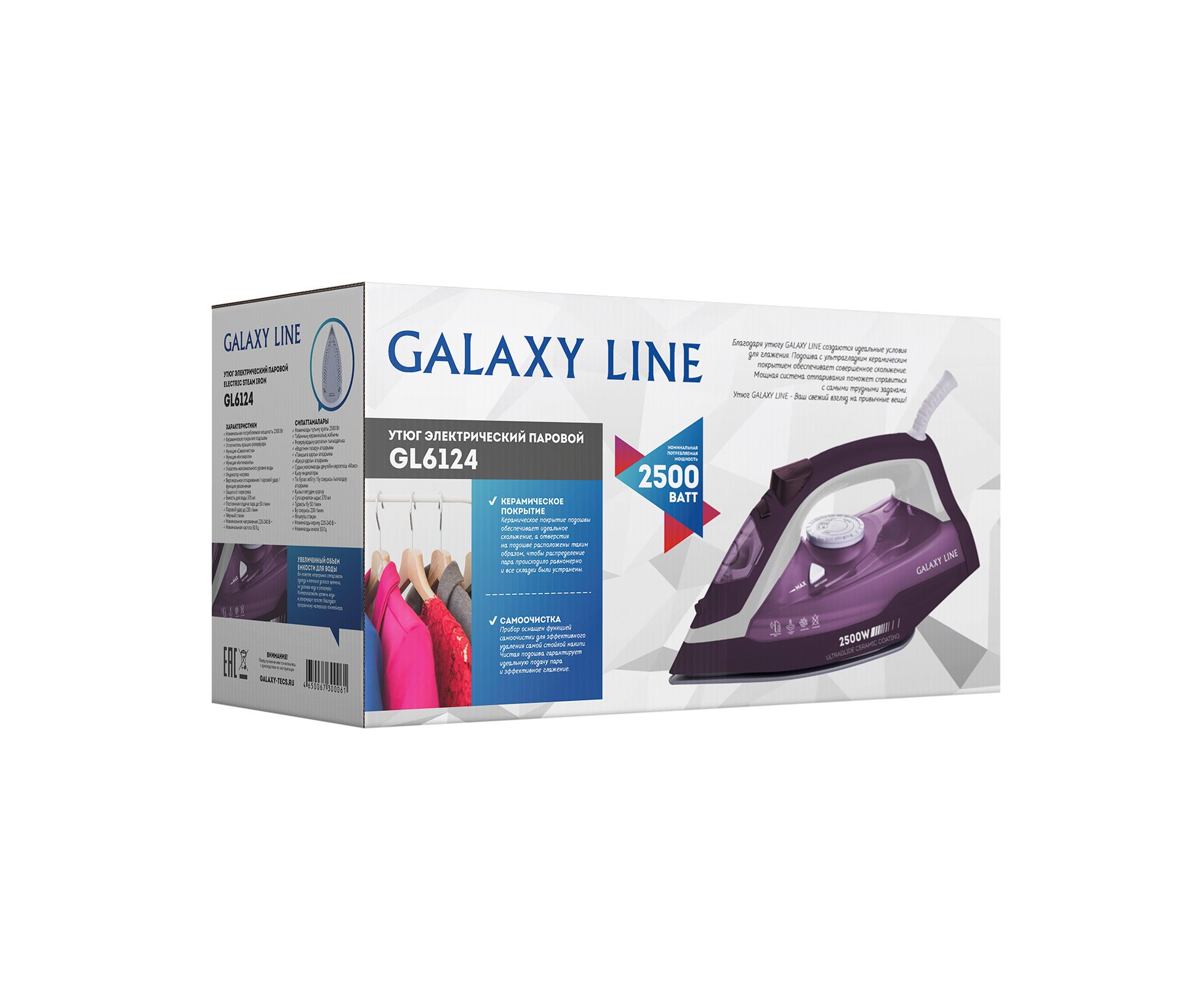 ԱպրանքանիշGALAXY LINE Հզորություն 2500 Վտ Արդուկի մակերեսԿերամիկա Ջրի տարողություն370 մլ Գոլորշու հարված 230 գ/ր