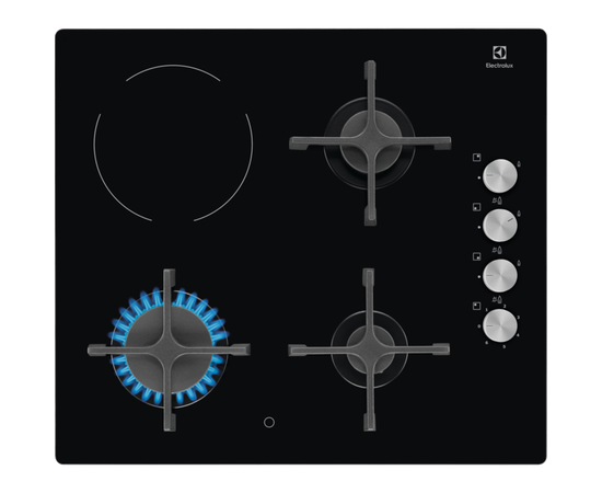 Ապրանքանիշ: Electrolux; Գույն: սև; Ընդհանուր բնութագիր Հայրենիք: Շվեդիա; Չափեր և քաշ Գույն 99: սև; Ընդհանուր բնութագիր Արտադրման երկիր: Իտալիա; Մակերեսը: 3 գազ + 1 էլեկտրական սալիկ; Պատրաստման նյութ : Մակերեսի նյութ` ապակե-կերամիկական///Վանդակացանցի նյութ՝ չուգուն; Կառավարման համակարգ : Պտտվող մեխանիզմ; Էլեկտրական կայծ: Առկա է; Հատկություններ: Գազի հսկողություն///Մնացորդային ջերմության ցուցիչ; Չափեր և քաշ Չափսեր: Լայնություն-58///Խորություն-51; Չափեր և քաշ Ներկառուցման չափեր : Լայնություն 55///Խորություն 47; Այրիչների տեսակ: 1 Hi Light այրիչ 18 սմ///1 խոշոր այրիչ///1 ստանդարտ այրիչ///1-տնտեսող այրիչ///Առջևի աջ այրիչ՝ 5.4սմ///առջևի ձախ՝ 10սմ///Հետևի աջ այրիչ՝ 7սմ