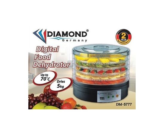 Ապրանքանիշ: Diamond; Գույն: սև; Ընդհանուր բնութագիր Հայրենիք: Գերմանիա; Չափեր,գույն և քաշ Գույն : սև; Հզորություն: 250; Կառավորման համակարգ: Սենսորային; Պատրաստման նյութ: ջերմակայուն պլաստիկ; Տարաների քանակ : 5; Տարայի բարձրության կարգավորում : Առկա է; Էկրան : Առկա է; Հատկություններ: Ապրանքների բարձրորակ չորացում///Կարգավորվող տերմոստատ///Հարմար է պաստիլներ պատրաստելու և բանջարեղեն, մրգեր, սունկ, ընկույզներ, հատապտուղներ, խոտաբույսեր, բուժիչ բույսեր, միս, ձուկ և հաց չորացնելու համար:///Ներկառուցված օդափոխիչ; Ջերմաստիճան : 40-70; Տերմոստատ : Առկա է; Ժամանակի կարգավորում: 1-48