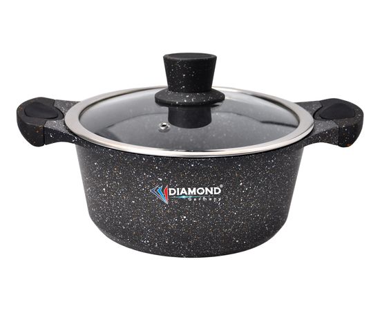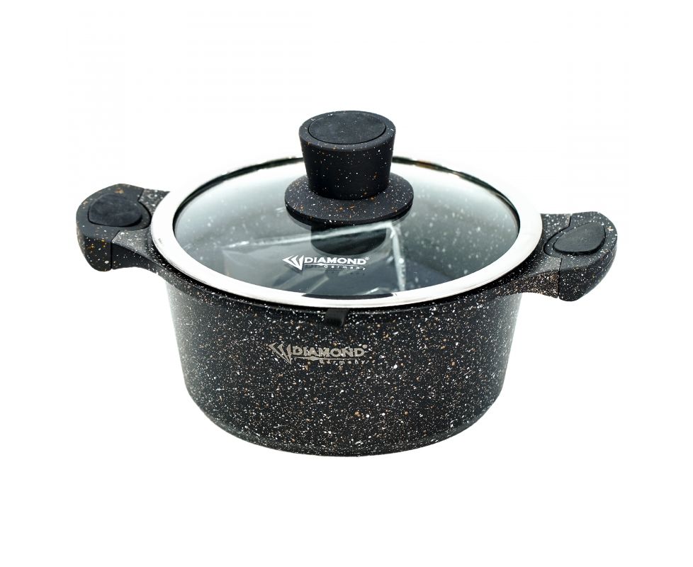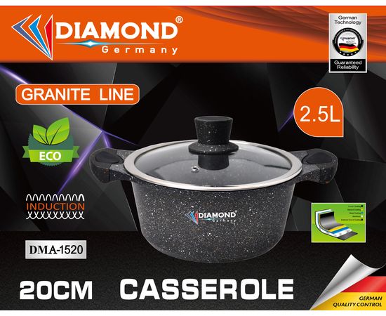 Ապրանքանիշ: Diamond; Գույն: սև; Ընդհանուր բնութագիր Հայրենիք: Գերմանիա; Չափեր,գույն և քաշ Գույն : սև; Պատրաստման նյութ : Ալյումինե; Ներքին ծածկույթ : Գրանիտե ոչ կպչուն ծածկույթ; Բռնակի նյութ: Ամուր բռնակներ; Կափարիչ : Առկա է; Կափարիչի նյութ: Ջերմակայուն ապակի; Ծավալ : 2.5; Ստորին հաստություն : Բազմաշերտ; Կիրառում: Ապակե կերամիկական///Գազ///Էլեկտրական; Տրամագիծ : 20
