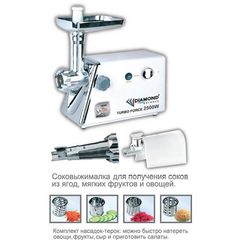 Ապրանքանիշ: Diamond; Գույն: Սպիտակ; Ընդհանուր բնութագիր Հայրենիք: Գերմանիա; Ընդհանուր բնութագիր Արտադրման երկիր: Չինաստան; Հզորություն: 2500; Արտադրողականություն : 1/1; Իրանի նյութ : Չժանգոտվող պողպատ և պլաստմաս; Սկուտեղի նյութ: Մետաղ; Գլխիկներ Սկավառակներ ցանցեր : 3; Դանակի նյութ: Չժանգոտվող պողպատ; Գլխիկներ Գլխիկներ : 3 կցորդ տնական երշիկեղեն և քյաբաբ պատրաստելու համար///Լրացուցիչ չժանգոտվող պողպատից դանակ///Հյութաքամիչ հատապտուղների, փափուկ մրգերի և բանջարեղենի հյութացման համար///Քերիչի հավելումների շարք. Դուք կարող եք արագ քերել բանջարեղենը, մրգերը, պանիրը և պատրաստել աղցաններ; Հետադարձ պտույտ Reverse : Առկա է; Շարժիչի գերբեռնվածության պաշտպանություն: Առկա է